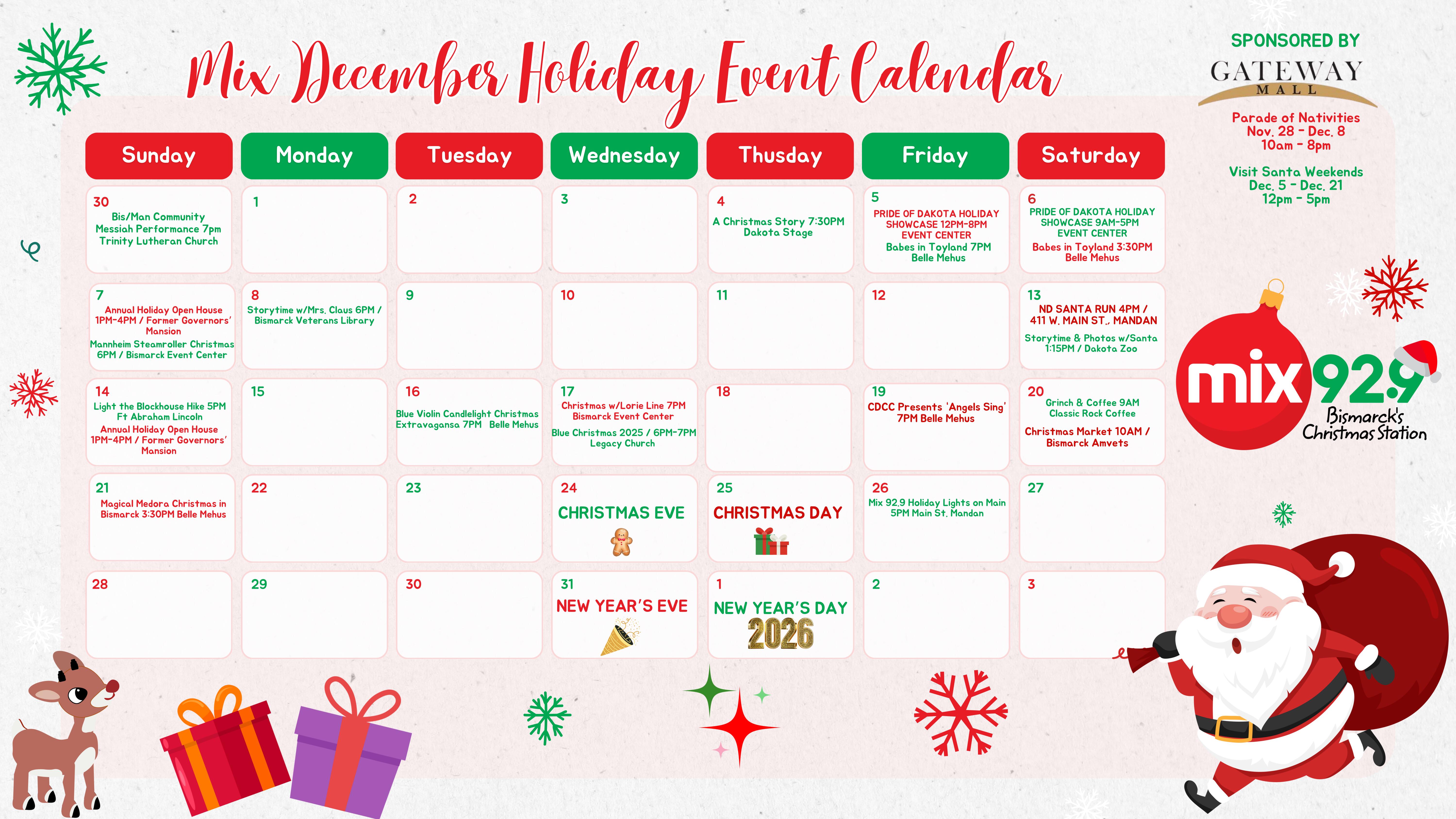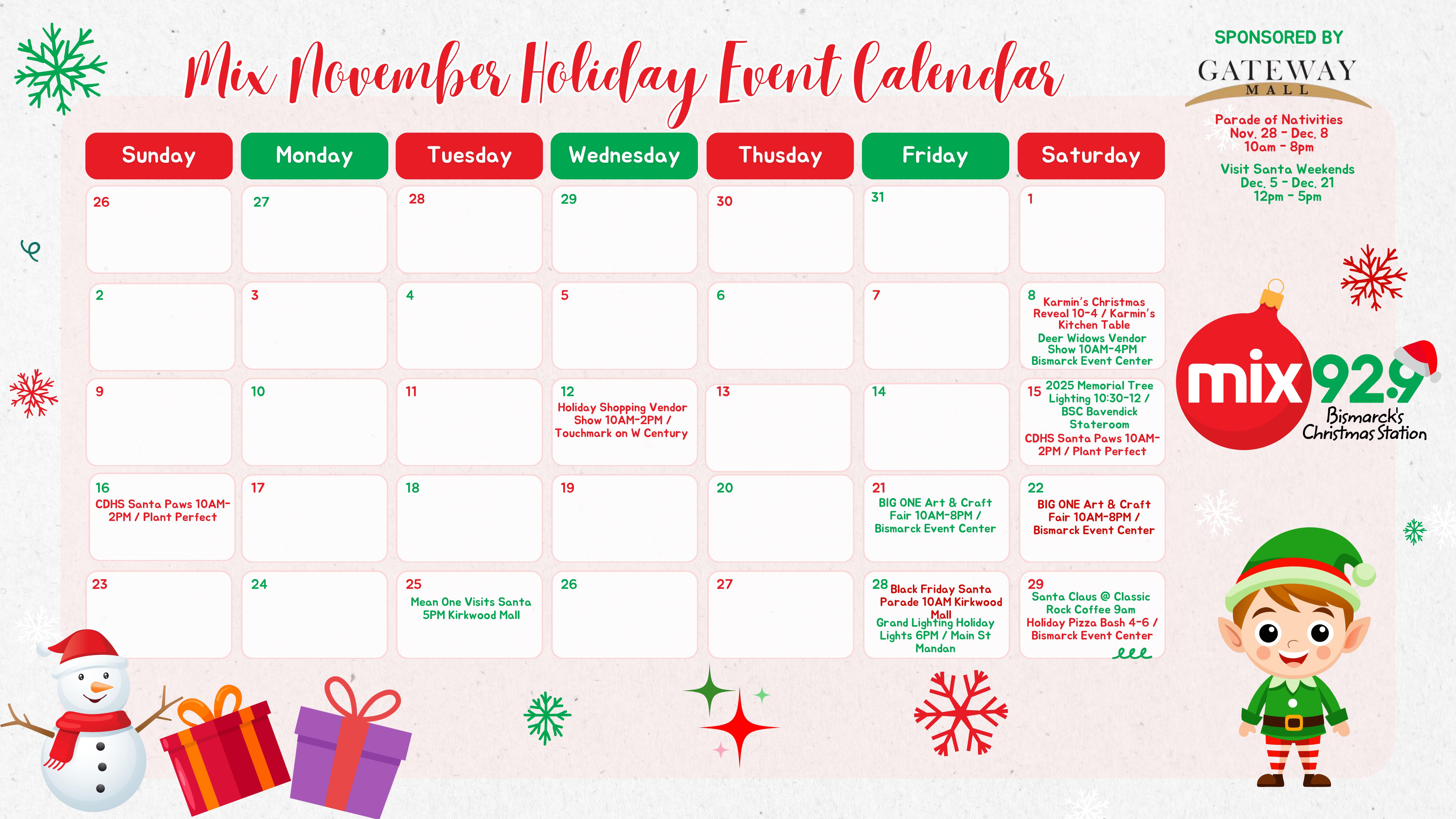 If you would like to add an event to our MIX Holiday Event Calendar, sponsored by Gateway Mall, please email, ginaschaefbauer@iheartmedia.com!